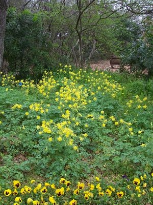 Bright yellow blooms appear on long branches that grow above the plant, with long spurs in the back. Prefers constant moisture, reseeds very easily and becomes unsightly with age – easily removed and make room for the newer plants that germinated.