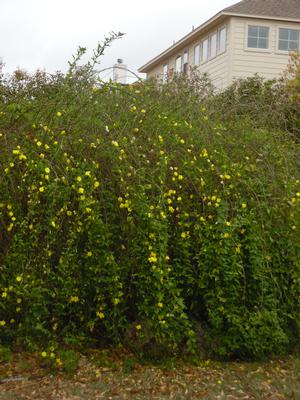 Primrose Jasmine is a fast-growing, semi-evergreen shrub with a sprawling habit, often used as a cascading groundcover or trained over fences and walls. This vigorous plant produces bright yellow, lightly fragrant, semi-double flowers in late winter to early spring, making it one of the earliest bloomers in Texas landscapes. It thrives in full sun to partial shade and prefers well-draining soil but is adaptable to various conditions. While not a Texas native, it performs well in many regions, especially in Central and South Texas, where winter temperatures remain mild.