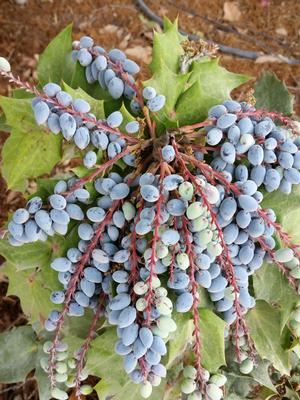 Fragrant yellow flowers appear in late winter on erect racemes, forming clusters of green berries in spring turning blueish-black in summer, providing food for wildlife.